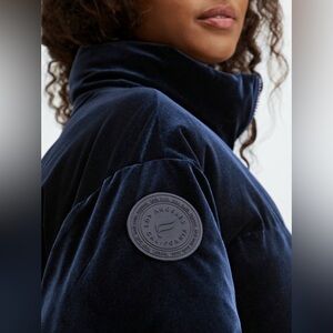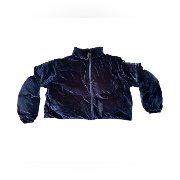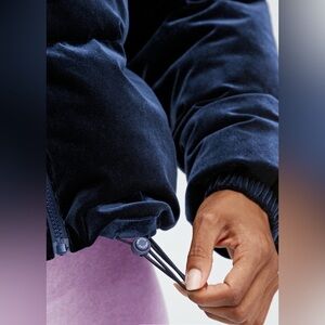 Luxurious velvet jacket. Rich navy color. Perfect for cool weather. Fabletics Navy Wander Velour Cropped Puffer Jacket-Size XL