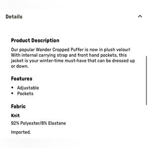 Fabletics Navy Wander Velour Cropped Puffer Jacket Size XL