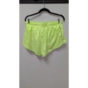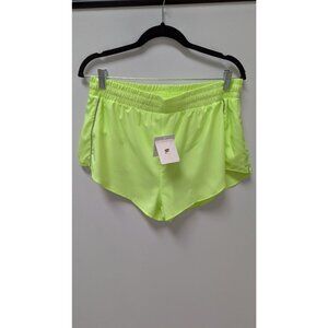 Fabletics Neon Spark Eco Full-Speed Running Shorts. Size Large. New with tags. It features an elastic waistband with a hidden drawstring, along with a briefs lining and silver striping.