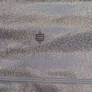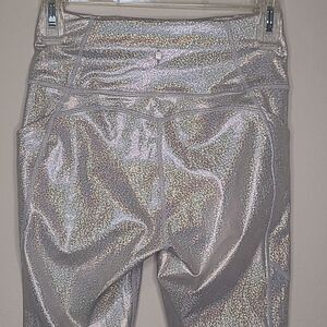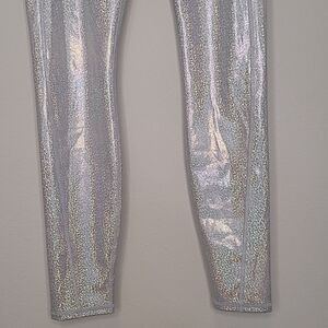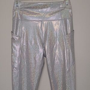 Assumed Size Extra Small or Small silver hologram glitter leggings from Fabletics. Pockets on both sides! I am usually an XXS or XS and these fit but are a little bit too big in the legs and the waist stretches so could most likely fit a small.