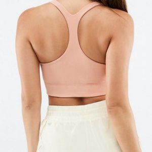 Double-layered, scoop-neck bra with a narrow racerback allows for maximum range of motion and extra support. Reversible style means more bang for your buck—and for your workout!