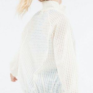 For those in-between-seasons months, throw on this lightweight design featuring a zip-up, mock-neck silhouette, and elastic cuffs.