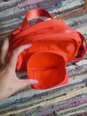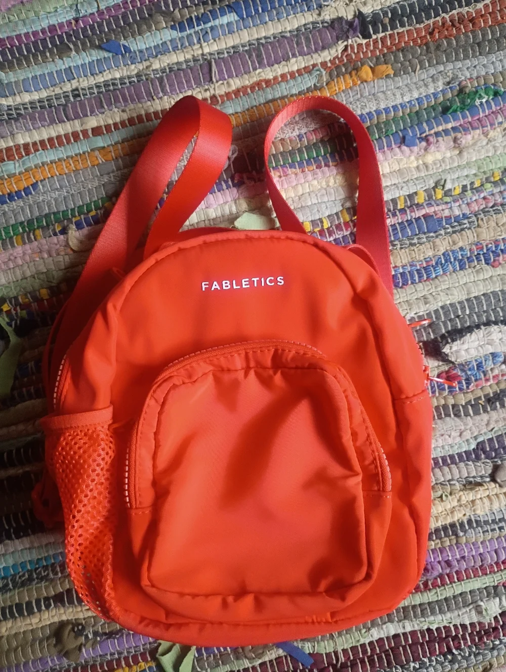 Compact Fabletics mini backpack in vibrant orange. Lightweight and versatile for everyday use. Front zip pocket and side mesh pocket for small essentials. Adjustable straps for comfortable carry.