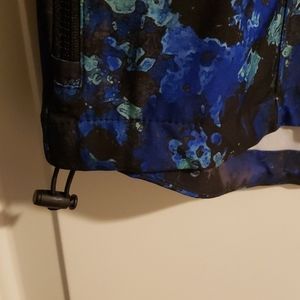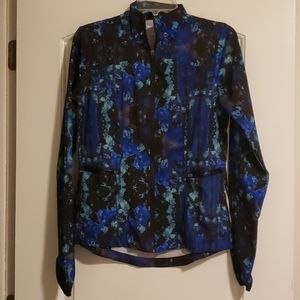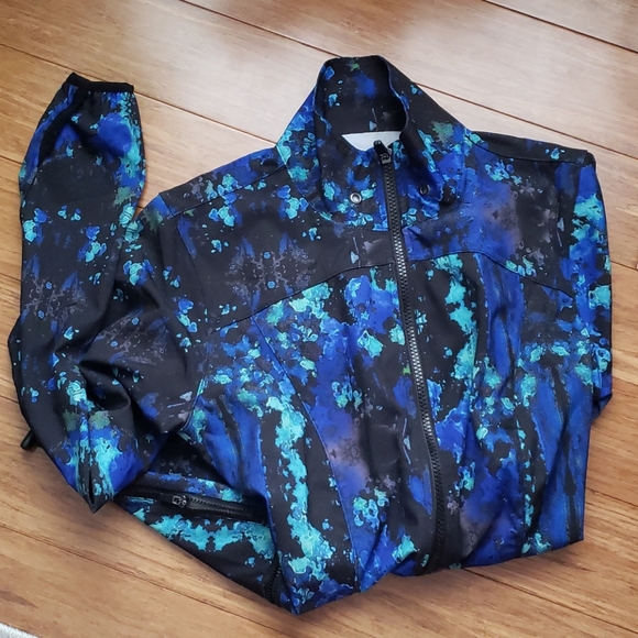 Such a cute and lightweight performance jacket, perfect for chilly morning runs! Has multiple zipper pockets, a tie to scrunch the waist, and thumb holes in the sleeves. Missing the string for the neck. XS size 4, also fits like a small