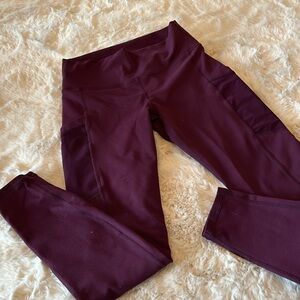 Beautiful leggings by Fabletics. Side pocket detail with a mesh pocket Cabernet color. Waist is approximately 12 inches across and the hip is approximately 14 inches across. Is at 25 inches. I am guessing this is a size small.