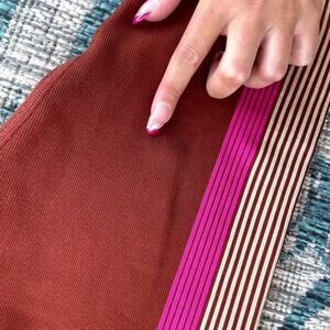 There appears to be a small, dark mark or stain on the reddish-brown fabric, indicated by the finger. It looks like a minor blemish rather than a tear or hole. The tag itself is slightly crinkled, which is normal for a garment tag.