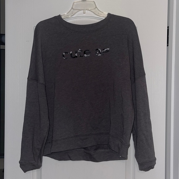 This Fabletics pullover has only been worn a handful of times! The “F” in “cute af” sports the Fabletics logo in camo. With its grey coloring, it’s a basic for all closets.