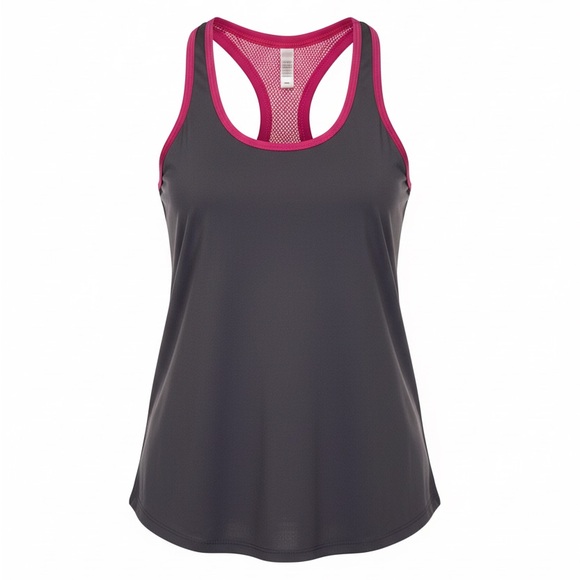 This workout tank is by Fabletics. It is a size small. It’s gray with magenta mesh. It’s in EUC with no holes, stains or tears.