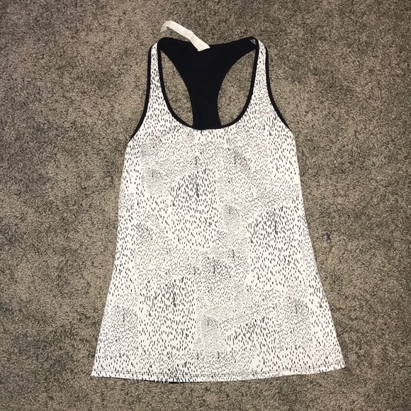 Fabletics Razorback Tank with white front with black specks. Tighter fit. Back in black with white specks. Goes great with any athletic bottom.