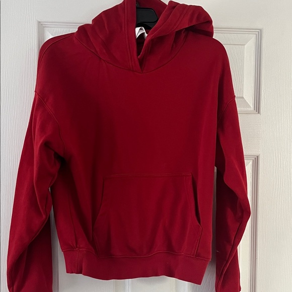Bold red pullover with adjustable hood. Soft fabric for comfort.