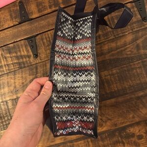 Holiday pattern on the sides, 9”L x 4”W x 10.5”H with strap drop 6”, open top