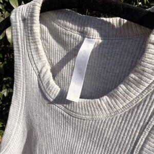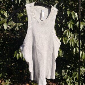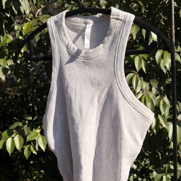 Fabletics ribbed racerback tank in a versatile light gray. Designed with a flattering high neckline and stretchy, supportive fabric that works just as well for workouts as it does for everyday wear. A great closet staple for layering or wearing solo.