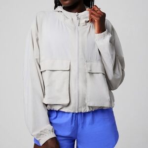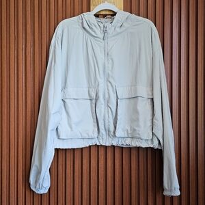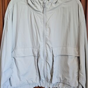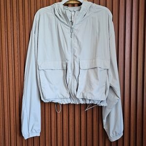 Fabletics Luna Grey ripstop cropped cargo jacket in size Large. Adjustable elastic cord waist and hood. zip-up front closure. Good used condition. Very small snag on lower right sleeve displayed in the last few photos.