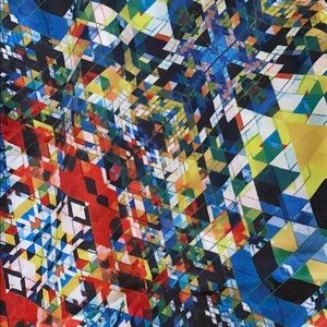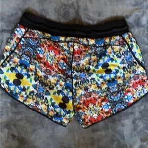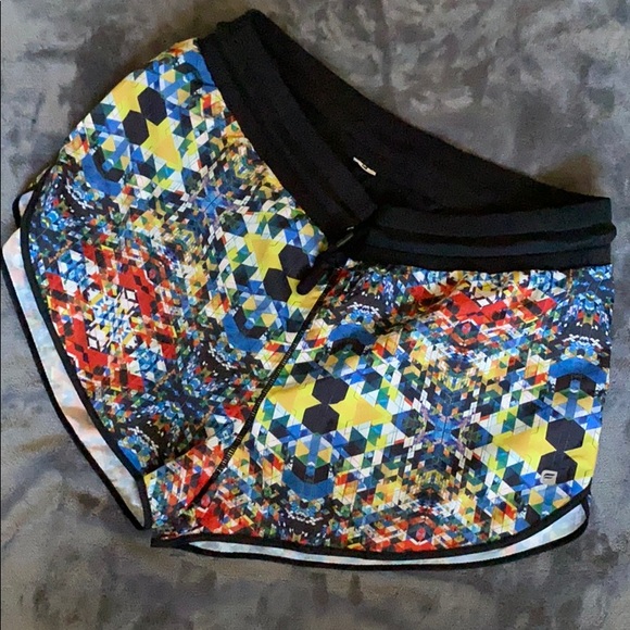 Women’s Fabletics stained glass run shorts in multi colors. Elastic waste band with black draw string. Reflective details. Flattering cut. Thin underwear lining inside the short. New without tags. Draw string is still in original state. Tag cut out before I tried on. Size Large. More like size 10 than 12. Pair with sports bra listing that matches.