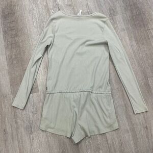 This romper from Fabletics is so soft & comfy! This romper has long sleeves, has a scoop neckline, has a 3 button front design, has a tie at the waistline, has pockets, is ribbed, & is made with a supima fabric blend. Size L. Will fit a 12/14 best.