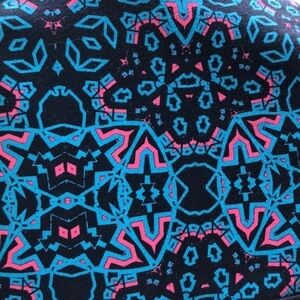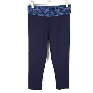 Fabletics Navy Blue “Salar” Style Capri Length Leggings. Mid-rise, foldover waistband. navy Blue solid color leg. Navy, pink, light blue printed waistband. 88% polyester, 12% Elastane. Size Small