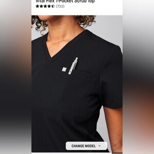 Sleek black scrub top from Fabletics. V-neck design and short sleeves. Single chest pocket with subtle logo tab. Smooth, professional finish. Comfortable daily wear.