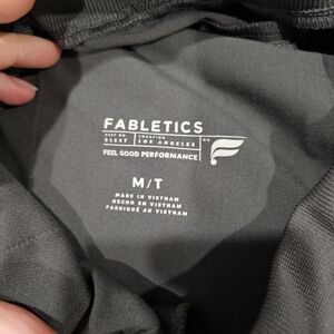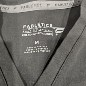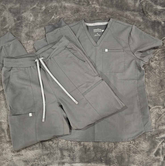 Great used condition Fabletics scrubs set. Medium Vital One Pocket top and Medium Tall High-Rise On-Call Jogger bottoms. Used for 3 months. Charcoal grey color. One small, barely noticeable spot of discoloration, may come out with wash.