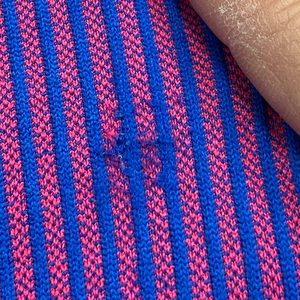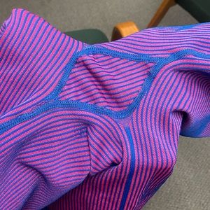 Good used condition, I only wore these 2 times! There is a slight imperfection on the back side, a little bit of rubbing (from my bike seat) blurring the blue lines. I included a photo of this.