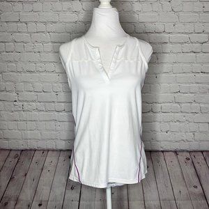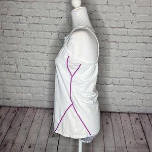 Fabletics Seria V Neck Tank Top. White with purple orchid stitching. Stretchy wicking material. Cool cutout in back. Mesh vents on sides.