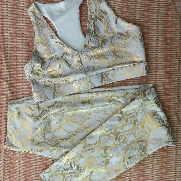 Define Powerhold high waist 7/8 legging (large) and on the go midi medium-impact sports bra (large). Color is copper foil snake.