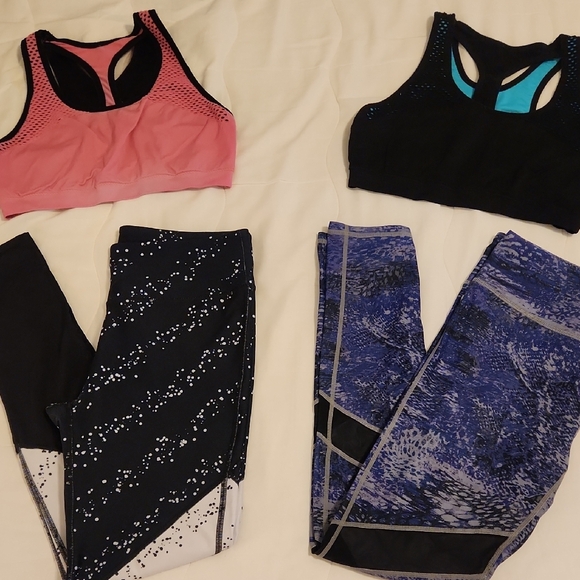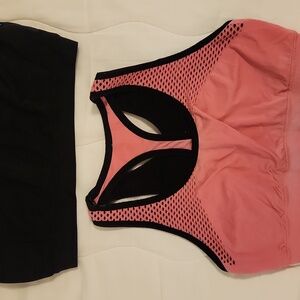 Set of two sports bras in coral/pink and black. Includes two pairs of leggings.