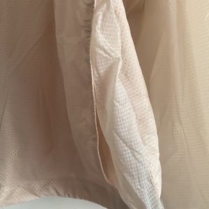 Light cream/beige windbreaker jacket. Bottom hem hits at the waist. Does not cover hips.