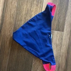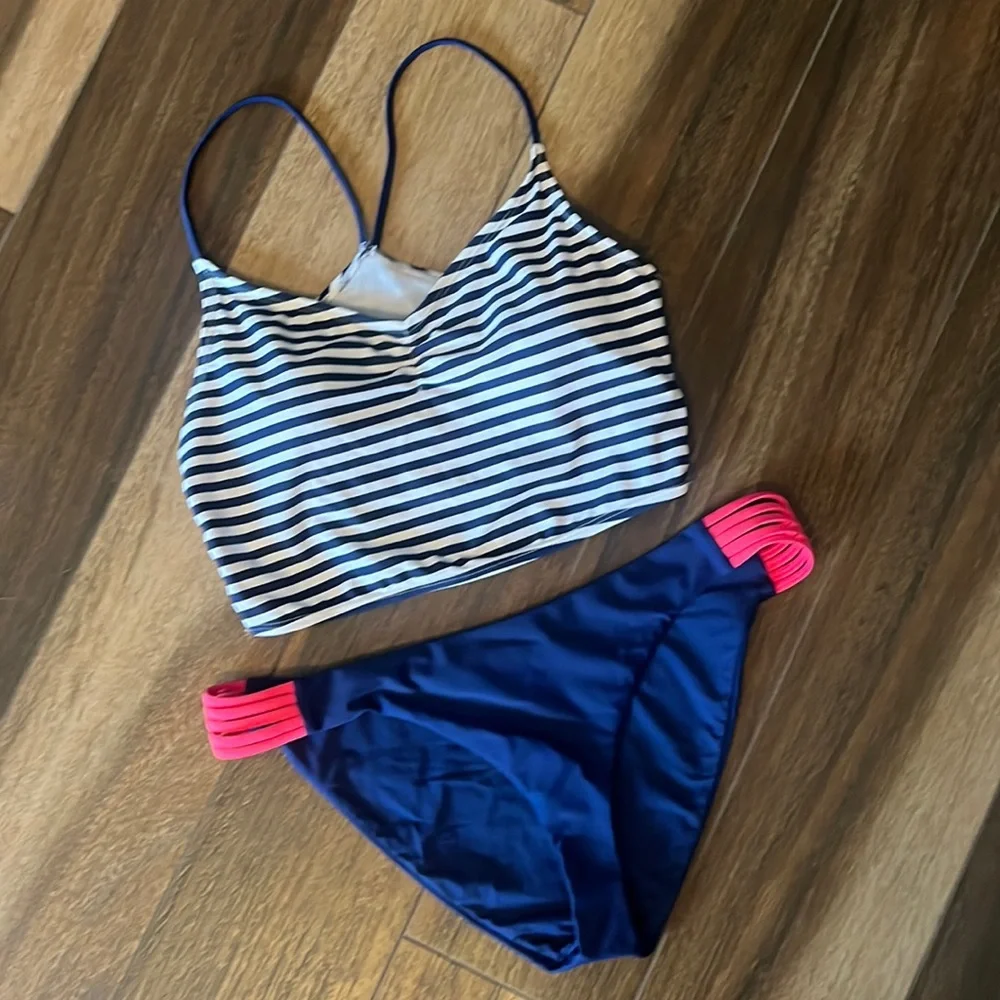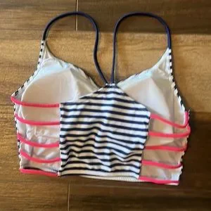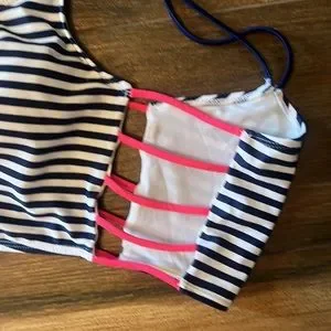 Blue and white striped top with strappy pink sides. Removable foam cups.
