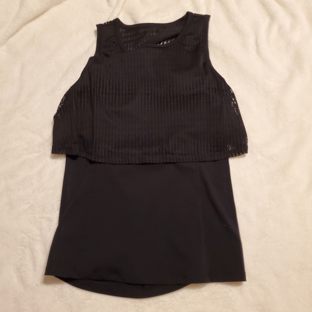 Black tank with built in shelf bra, top layer of mesh, and an open back design. Size medium.