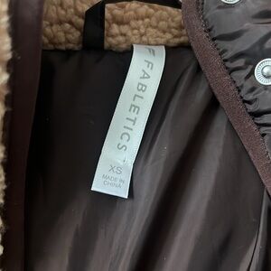 Cozy tan sherpa fleece jacket featuring brown accents. Perfect for warmth and style. Worn one time