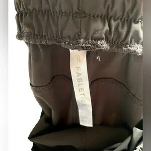 Includes two side zipper pockets and a wide elastic waistband with plastic tipped drawstrings.