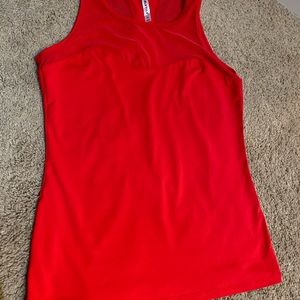 True red and cute for working out or running errands! Fabletics athletic material top with mesh at the top on front and back. This works with a sports bra.