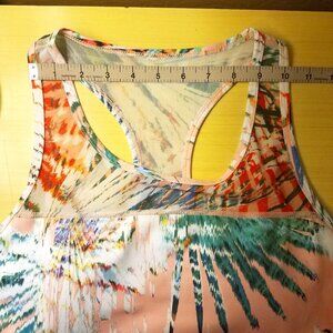 Fabletics tropical print sports bra, no size tag. See pics for measurements. My bra size is 36C, and this is a bit too large for me. I wish it fit me because it is a great print and a very comfortable sports bra! The top part of the sports bra is see-through mesh, and the bottom part is a very soft material.