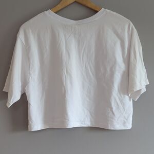Stylish white crop top. Features colorful rainbow text design. Perfect for casual wear.