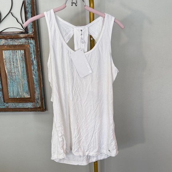 Lightweight white tank with racerback silhouette. Breathable fabric for workouts and everyday wear. Subtle brand tag at hem. Easy layering piece.