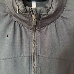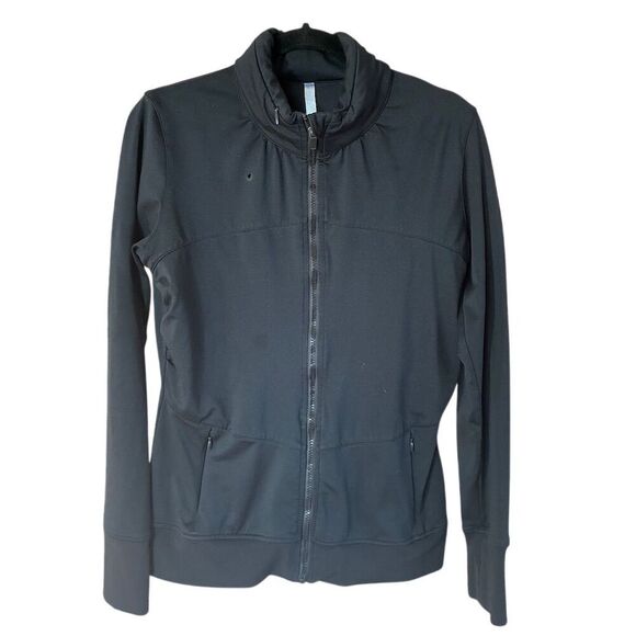 Keywords: Fabletics, women's jacket, black jacket, workout jacket, casual jacket, lightweight, vented back, hidden hood, activewear, athletic, machine washable, pre-owned, medium size, zip closure, all seasons.