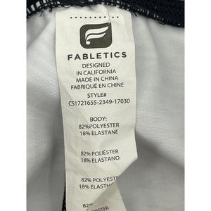 "Fabletics Women's activewear leggings in size S. The design features a black and white striped pattern. These capri style leggings are pull-on and made from stretchable polyester."