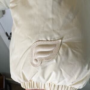 Fabletics Women's Cropped Cream Puffer Jacket Size 1X, has an adjustable elastic along the bottom of the jacket as well as a strap on the inside in case you want to take the jacket off but don’t want to misplace it, you can wear it like a seatbelt and let the coat hang like a cape. In excellent used condition, no flaws, pit to pit 21” length 23”