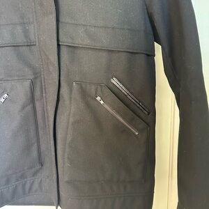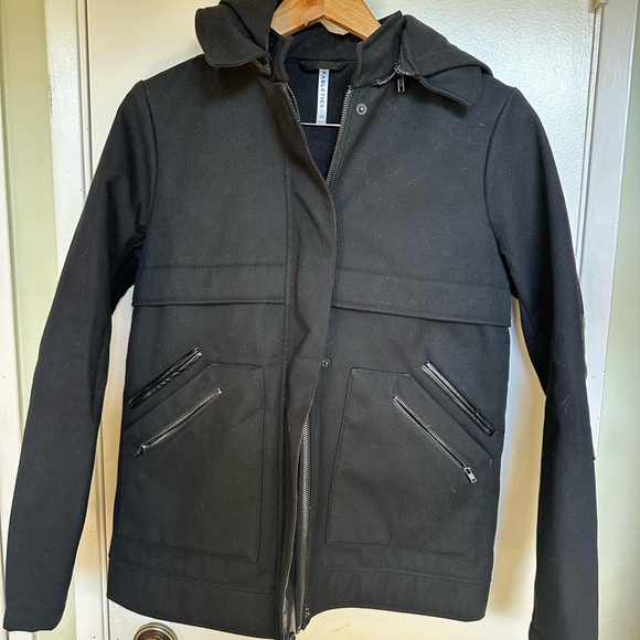 Stay stylish and warm with this sleek black hooded jacket. Removable hood. excellent conditionn