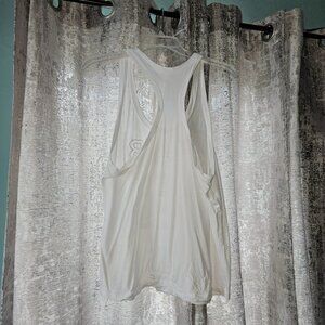 White athletic tank top with reflective lettering on front.