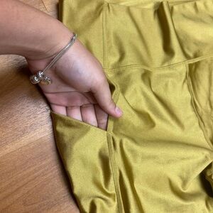 Shimmering gold leggings with a flattering high-waist design. Ideal for fitness or everyday style.