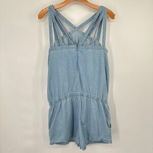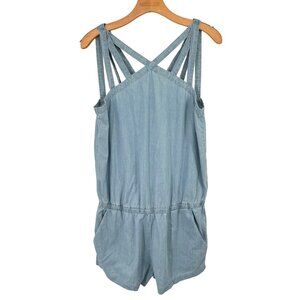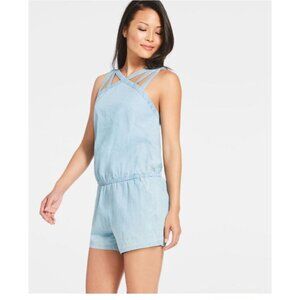 Fabletics Women's chambray Blue Denim Romper Pockets Crisscross Straps sz medium