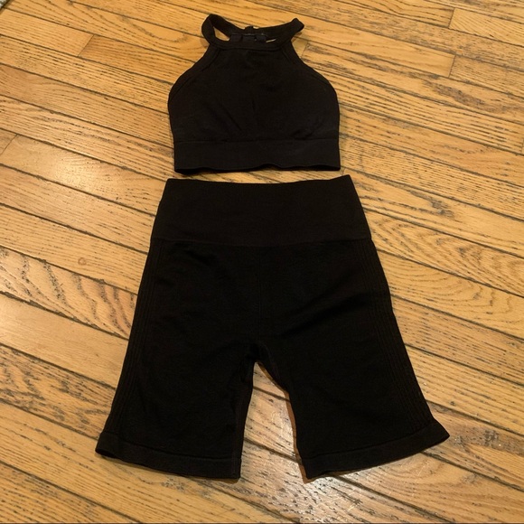 Fabletics work out set, worn once! High waisted Bike shorts and sports bra with really cute design on the back! Great condition since I only wore it once!