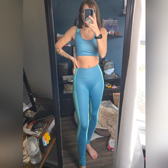 matching fabletics set, only worn once! full length leggings with phone pocket on back. great material for cardio. tags have been removed but they are size xxsmall. sports bra is medium impact with removable pads