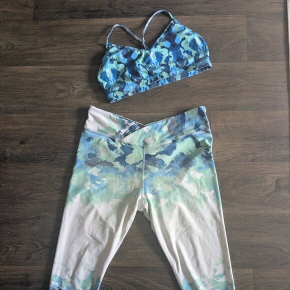 Matching sports bra and capri length legging set. This sports bra does not have pads and is medium support, the leggings have a flattering v shape to snatch your waist.