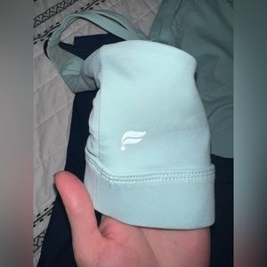 Size medium workout tank from Fabletics. Dark blue tank with built in mint green sports bra. Pads not included. Criss cross design in the back. Flowy style. In good condition.