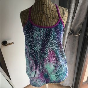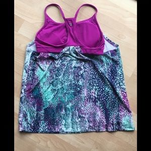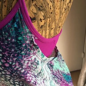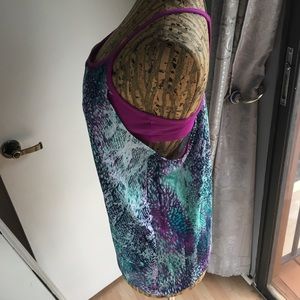 Fabletics Workout Top. In good shape, the front panel seam has small tear where it is stitched to the purple part. Not really noticeable as you can see by the picture. It’s probably easily fixed or it won’t make much difference if it’s not repaired. Size L.