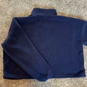 Fits like a xs/s. Navy blue. Sleeves are too short for me (I am 5’8”).