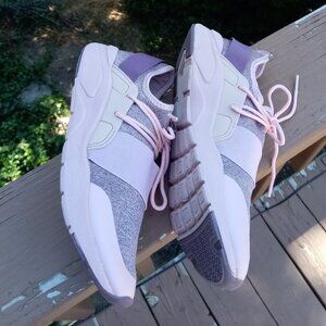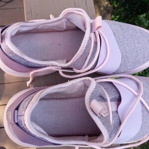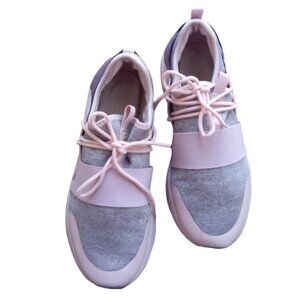 In good preowned condition. Gray and pink. Nice padded insoles and front lace up with cross-over elastic for comfort. All man made materials. From a smoke free and cat/dog friendly home.