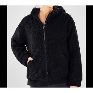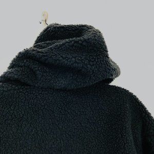 Black oversized polar fleece zipper hoodie. Long sleeves. Pockets. Jersey lining. Bust 46”, length 26”.